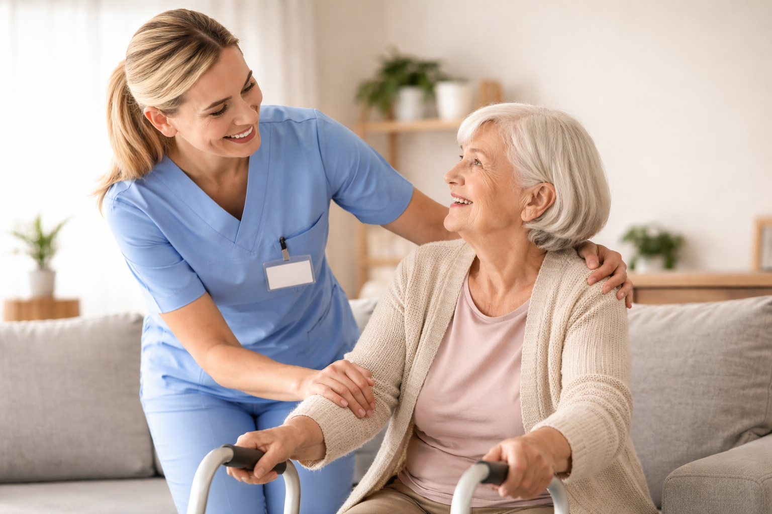 Pflegehelferin gibt Seniorin Hilfestellung
